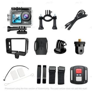 همراه با مجموعهای از لوازم جانبی شامل کیس ضد آب، پایههای نصب متنوع و بند اتصال که امکان نصب دوربین روی کلاه، دوچرخه، موتور و غیره را فراهم میکند.